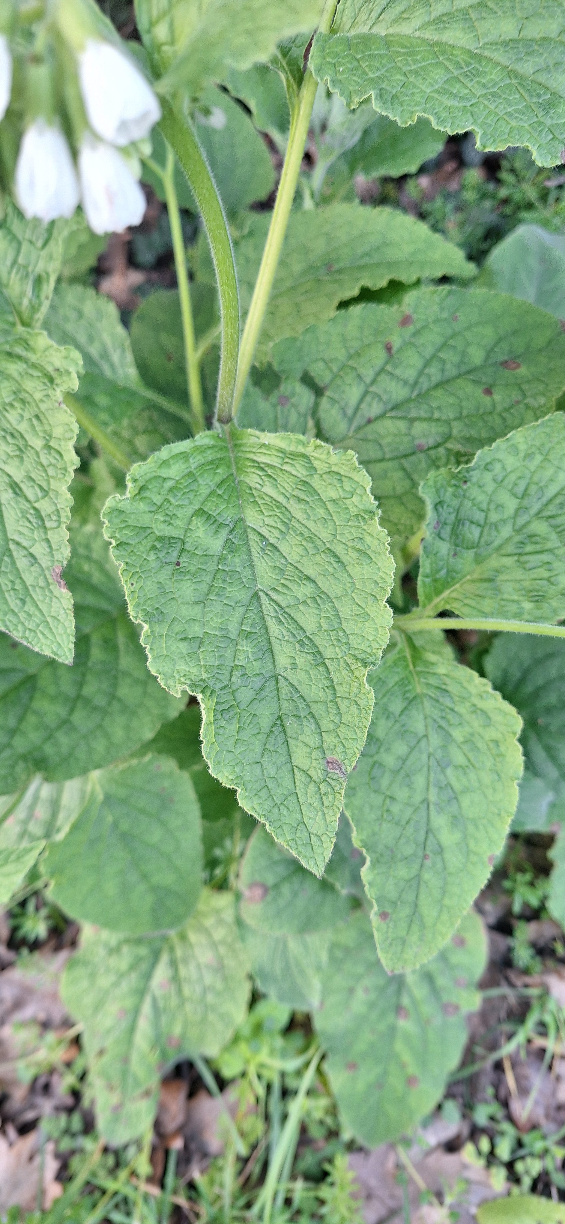 The leaf and stem of a white comfrey plant